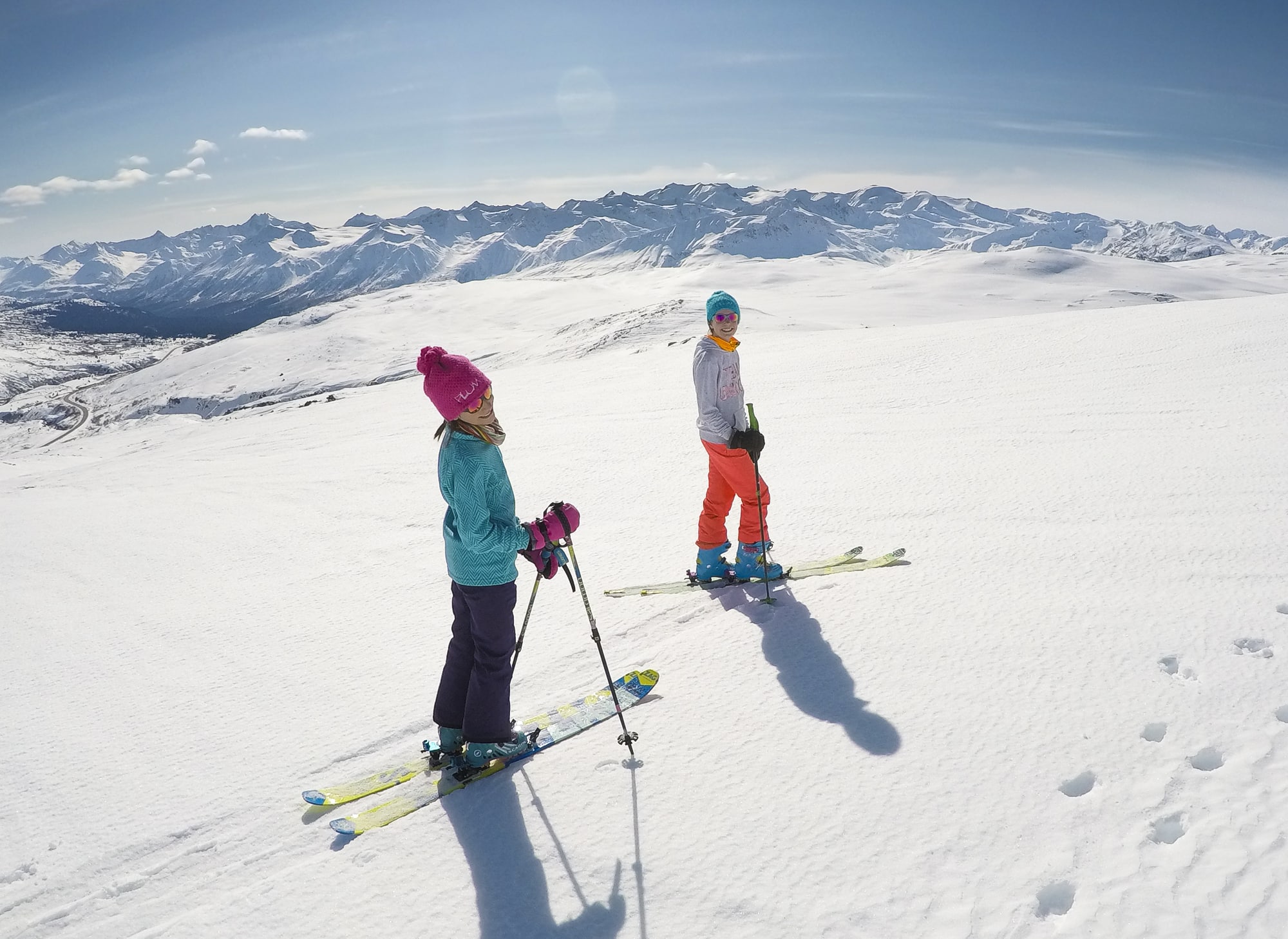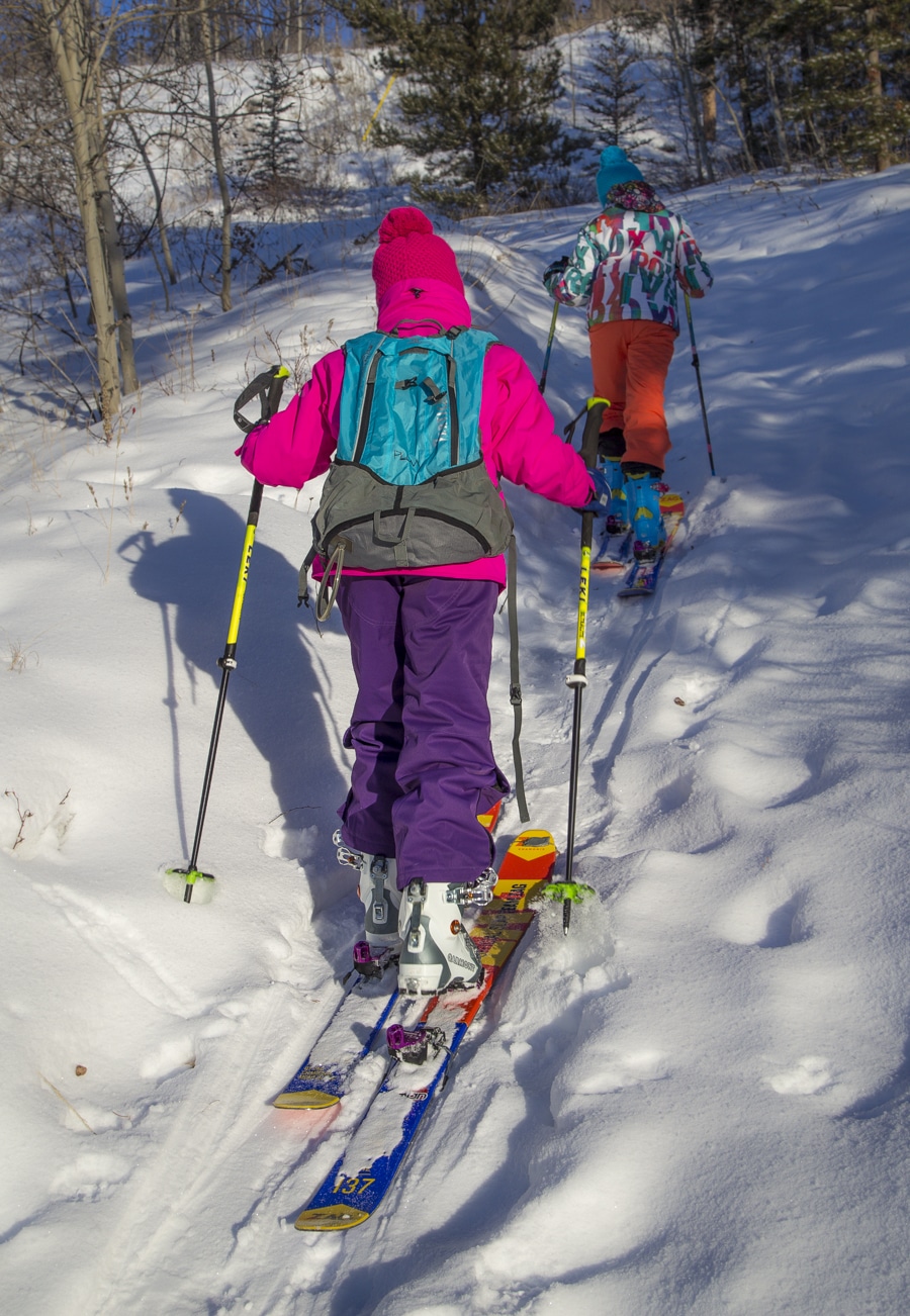 I geared my girls up with mini alpine touring setups, keeping their gear as light as possible. It helps to bolster enthusiasm and really improve the safety. Doing this does not require a second set of equipment to ski at the resorts. Remember, light is right on both the ascent and descent. Nowadays, with the increase in popularity of backcountry skiing, there are a few more options. My girls started when they were 6 years old with regular ski boots, customized light touring bindings (Silvretta Pure) and light downhill skis. The weight was not perfect, and comfort and range of motion of the boots for skinning up were not optimal. However, as an introduction to short and easy slopes, it was good enough. We also tried some light adapters (like Alpine Trekker for kids) and it was OK, but a bit heavy and not comfortable because it made them stand a little too high on their skis.
