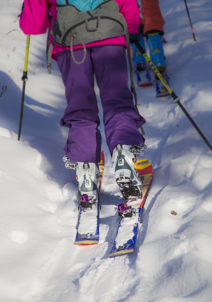 Compared to boots and bindings, the skis are the easiest parts of the equipment to find. Any kind of skis can be used, but lighter is better. Be sure they are good all terrain skis, so they will not sink in deep snow; furthermore, narrow skis make it next to impossible to make turns in variable depth and conditions. Some parents may choose to take skis which are a bit shorter than usual, and these are good as long as you do not ski in deep snow. A few brands are offering little and light backcountry skis and even alpine touring skis.