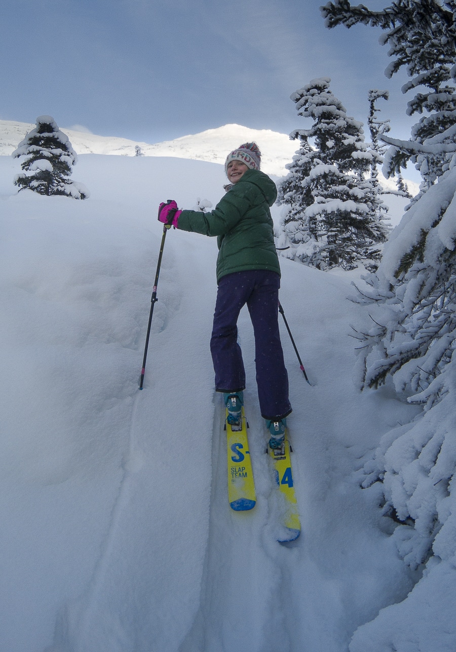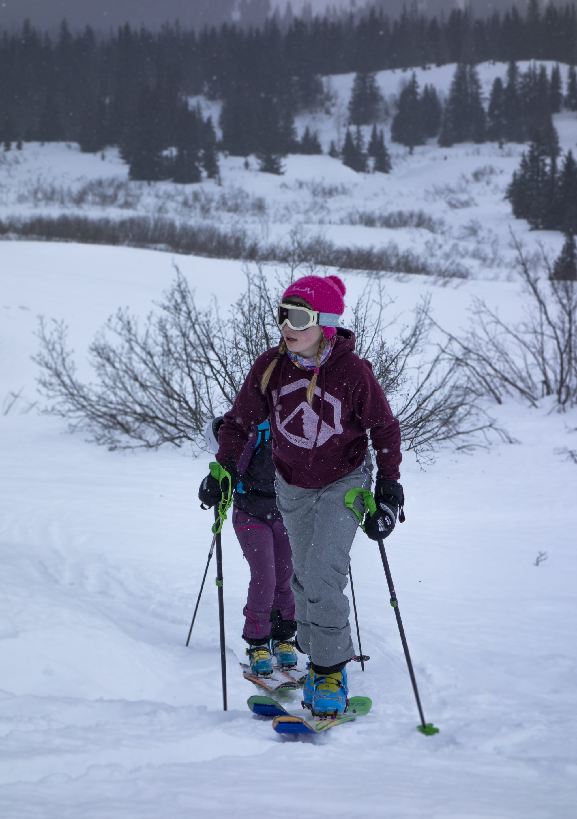 When we were finally able to find real alpine touring boots in size 22, it was a real game changer. We were then able to use light weight tec-bindings. Lightweight freeride skis for kids also arrived on the market, and this made them able to ski easier and happier. What an improvement! Skinning up was easier, especially with the increase of range of motion and skiing was even more enjoyable because of the quality light skis for kids. Turns in the variable snow conditions/depths were easier; my little one was flying down the mountains with ease!