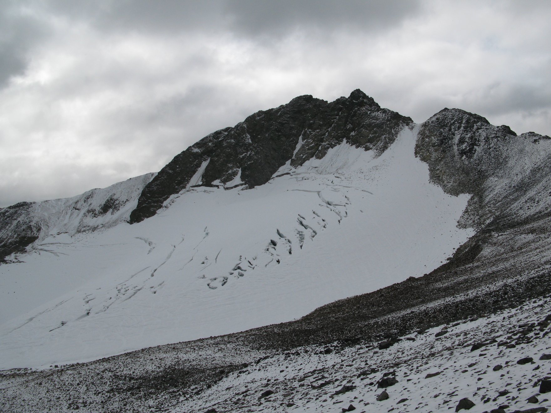 The first picture was taken a few days ago, it looks like it is inviting for a few turns, the snow is good, but there is just enough snow to hide some good crevasses right in the middle of this nice slope. The second picture is exactly the same location, you can see the holes. And the third ones is still the same location, but a few years ago in summer, with still a bit of snow from the previous winter filling the crevasses. Interesting too see how the upper part of the glacier has changed in just a few years.